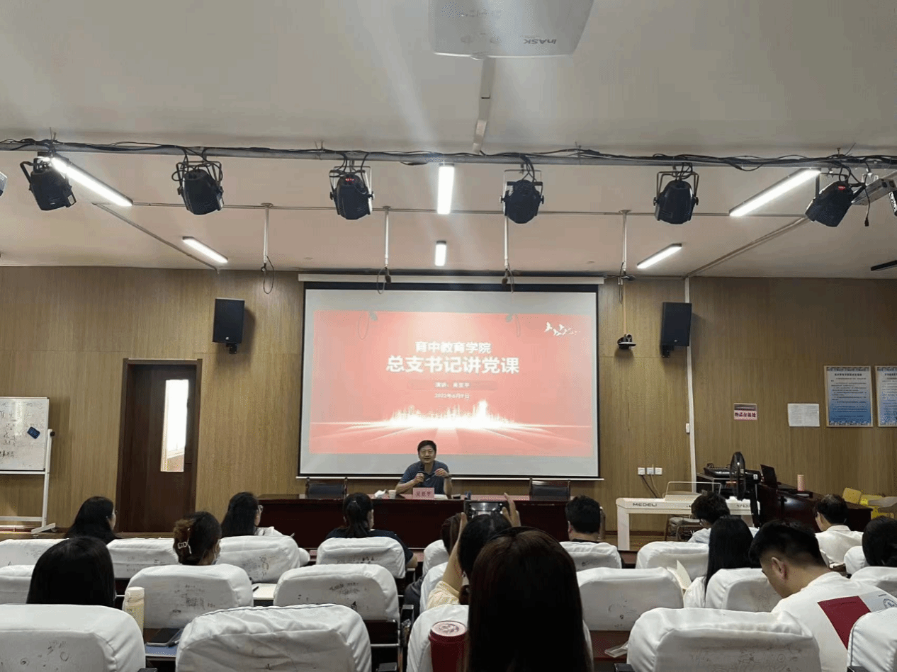 根据学校工作安排,为扎实推进党史学习教育常态化、长效化,进一步加强我院广大师生的党性教育,激励党员立足岗位、接续奋斗、实干担当。6月9日上午,mg4355vip检测中心党委副书记吴亚平来到育中教育学院,在5—2阶梯教室,举办以“总支书记讲党课”为主题的讲党课活动。育中教育学院党总支副书记徐冉、执行院长姚月芝等领导、全体党员、教师及学生代表共40余人参加了此次活动。
